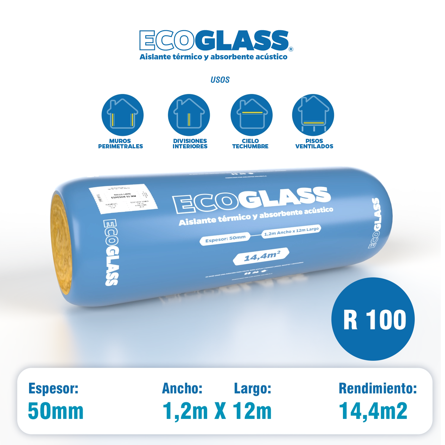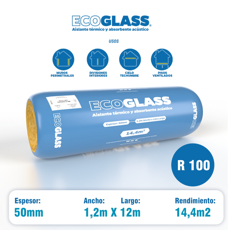 Lana de Vidrio Ecoglass Rollo Libre 50 mm R100/100 1,2 x 12 m